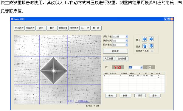 測量分為人工及系統(tǒng)自動測量。自動測量對工件表面光潔度要求較高;多數(shù)情況下人工測量更為準(zhǔn)確。測量時根據(jù)實(shí)際所用試驗(yàn)力及放大倍數(shù)設(shè)置后進(jìn)行操作。首先保存圖片到自定義文件夾,方便生成測量報(bào)告時使用。其次以人工/自動方式對壓痕進(jìn)行測量,測量的結(jié)果可換算相應(yīng)的洛氏、布氏等硬度值。